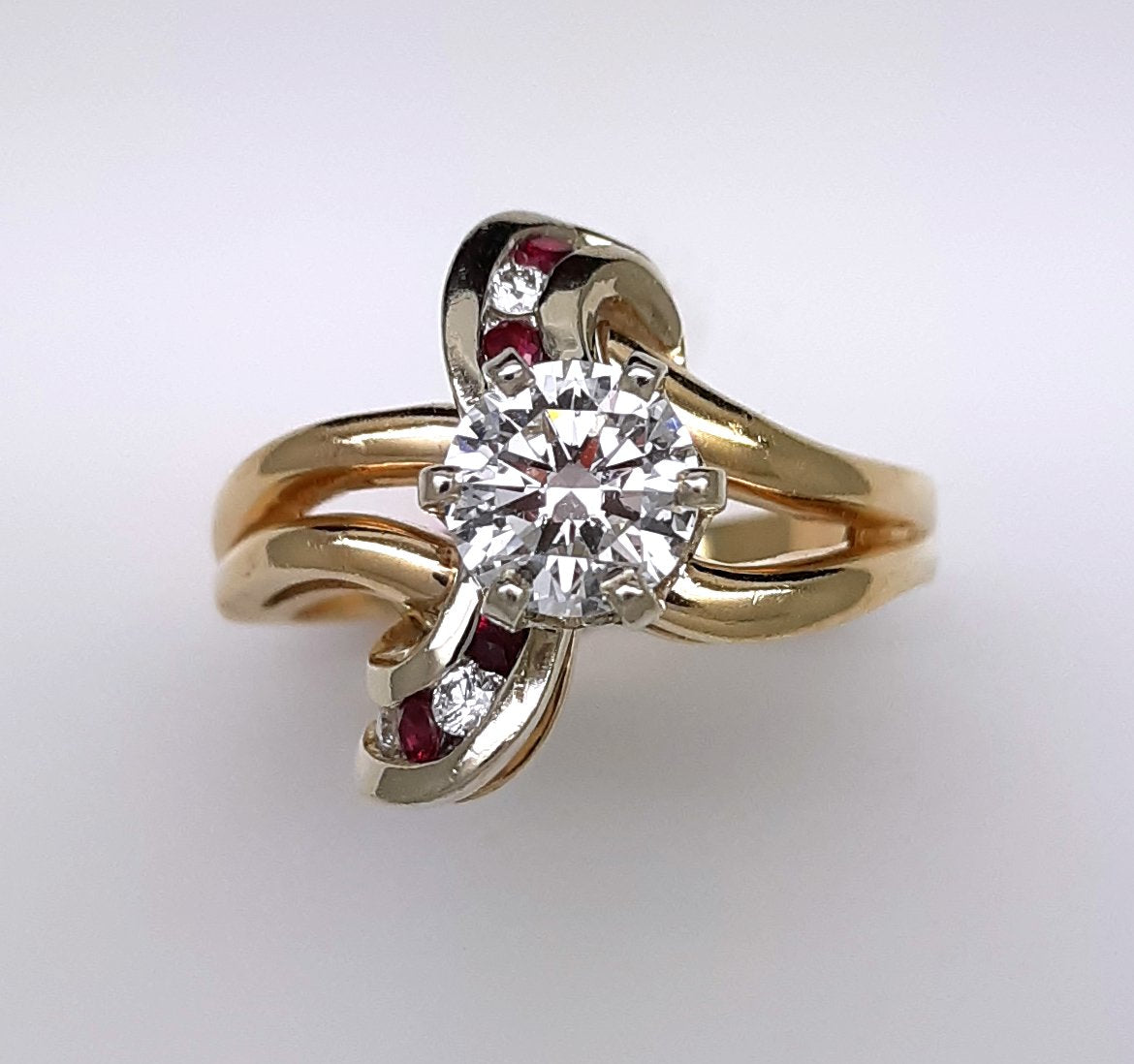 This is a great looking and well made estate ring. It has a Cadillac design. But more importantly, it is built like a Cadillac as well. Of course, this makes no sense unless you are aware of the fact that a lot of rings can have a Cadillac design, but they are built like a Datsun. The center diamond is firmly and securely set into a 6 prong 14k white gold head. It measures approximately 6.17 mm – 6.20 mm in diameter x 3.78 mm deep. Depth is approximate due to the restrictions of the mounting. It weighs approximately 0.88 carat. The weight was estimated by mathematical formula. The color is approximately M in the mounting. The clarity is a VS1. There is no florescence. It has a 63% table and a 6.1.1% depth. As you can see from the attached photos it has a beautiful and lively appearance. This thing really sparkles. Set into a 14k white gold channel above and below the center diamond are three transparent near colorless round full cut diamond melee with an estimated, combined and approximate total diamond weight of 0.06 carats. Their colors are in the G to H range and the clarities vary from VS1 to SI1 (all of them are very eye clean). Alternating between the diamonds are a total of four transparent red natural ruby melee with a combined, estimated and approximate total weight of 0.10 carats.