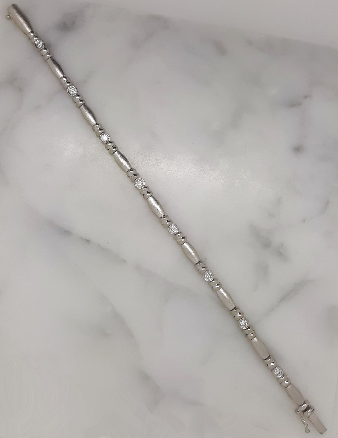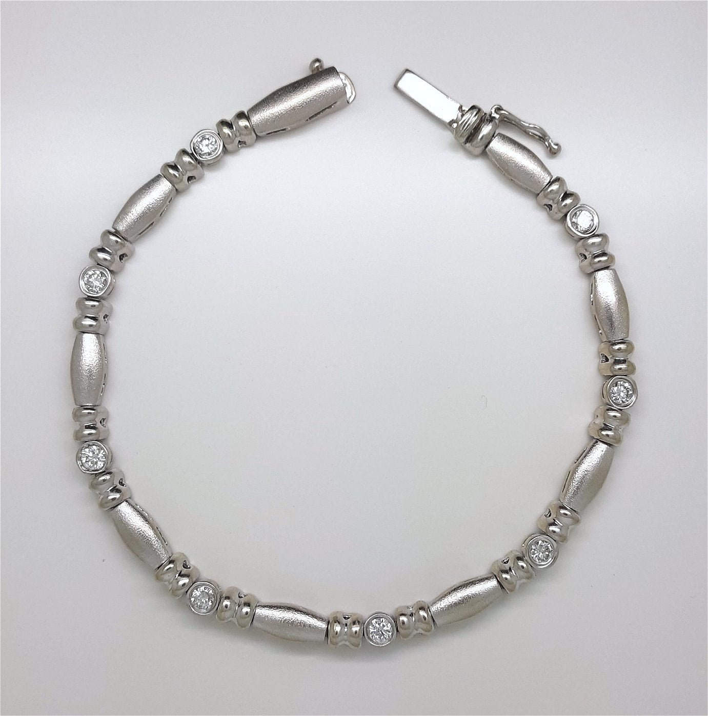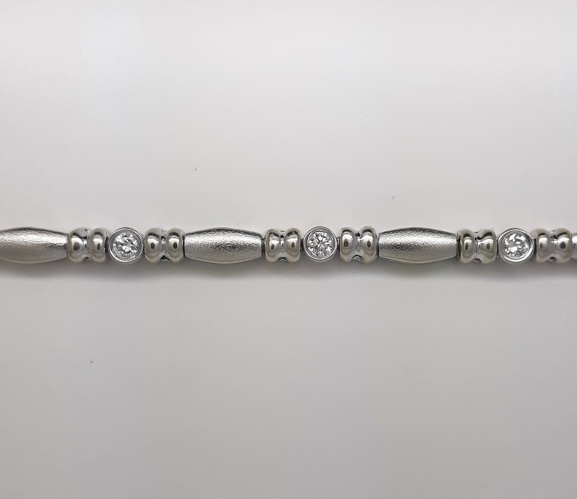Here is a stunningly beautiful piece of estate jewelry consisting of eight bright, white and sparkling tube set round brilliant cut diamonds comprising a bead and reel design accented with both high polish and satin finished white gold. This bracelet is heavy and very well made for durability and a long life span.