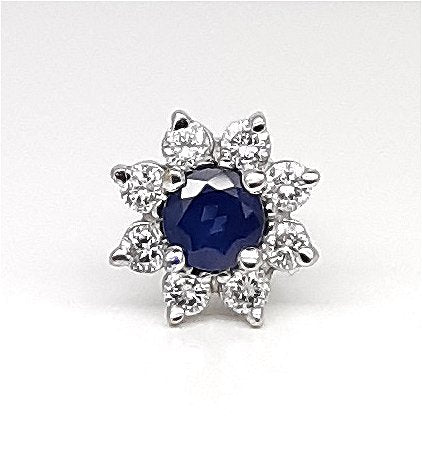 Earring #1. Set into four white gold prongs in the center is one transparent very dark blue round mixed cut natural sapphire measuring approximately 5.10 mm x 5.09 mm in diameter and 2.95 mm deep; and weighing approximately 0.55 carat or 1/2 carat. The weight was estimated by mathematical formula. The clarity is a 7 and the clarity is a Type II. This is a nice and attractive commercial grade sapphire. In the halo surround there are a total of eight (8) transparent near colorless round full cut diamond melee weighing approximately 0.05 to 0.055 carat each for an estimated, combined and approximate total diamond weight of 0.41 carats. The diamond have an average and approximate color of G and an average and approximate clarity of SI2 to SI3.