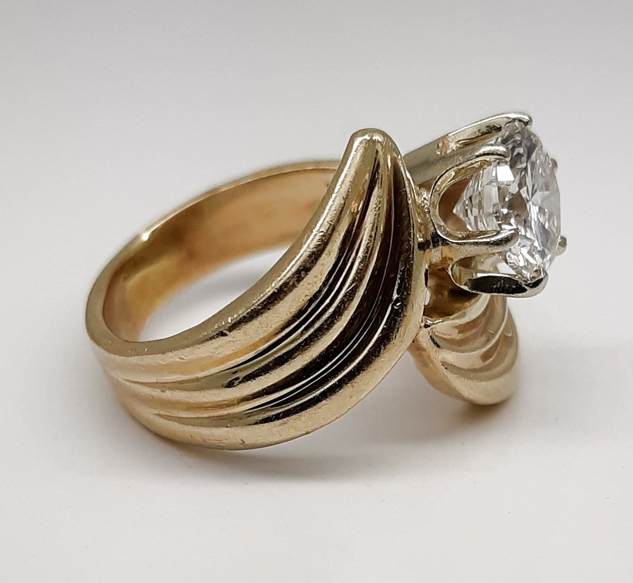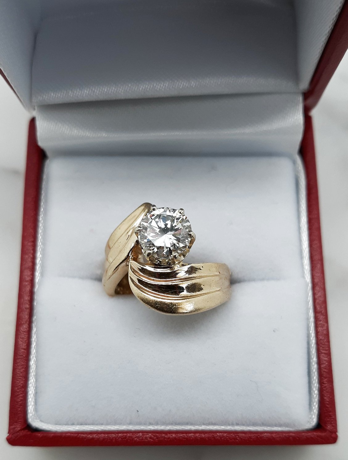 A lovely natural 1.19 carat diamond is the stunning and dramatic focal point of this classic looking 14k yellow gold split gadrooned shank lady's fashion ring. The diamond is securely set into a 14k white gold six prong head for long term durability and protection. The diamond measures approximately 6.77 mm – 6.80 mm x 4.24 mm and weighs approximately 1.19 ct. The weight was estimated by mathematical formula. It has a 67.7% table and a 62.4% depth. Both the polish and symmetry are good. The color is an M (faint yellow) in the mounting, and an SI2 in clarity. The inclusions are not readily apparent or visible to the naked eye.. Although the color is M, it still has what appears to be a nice bright white and lively appearance. Please see the color photographs for a visual reference