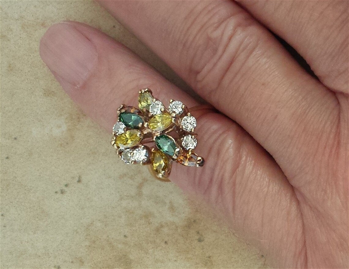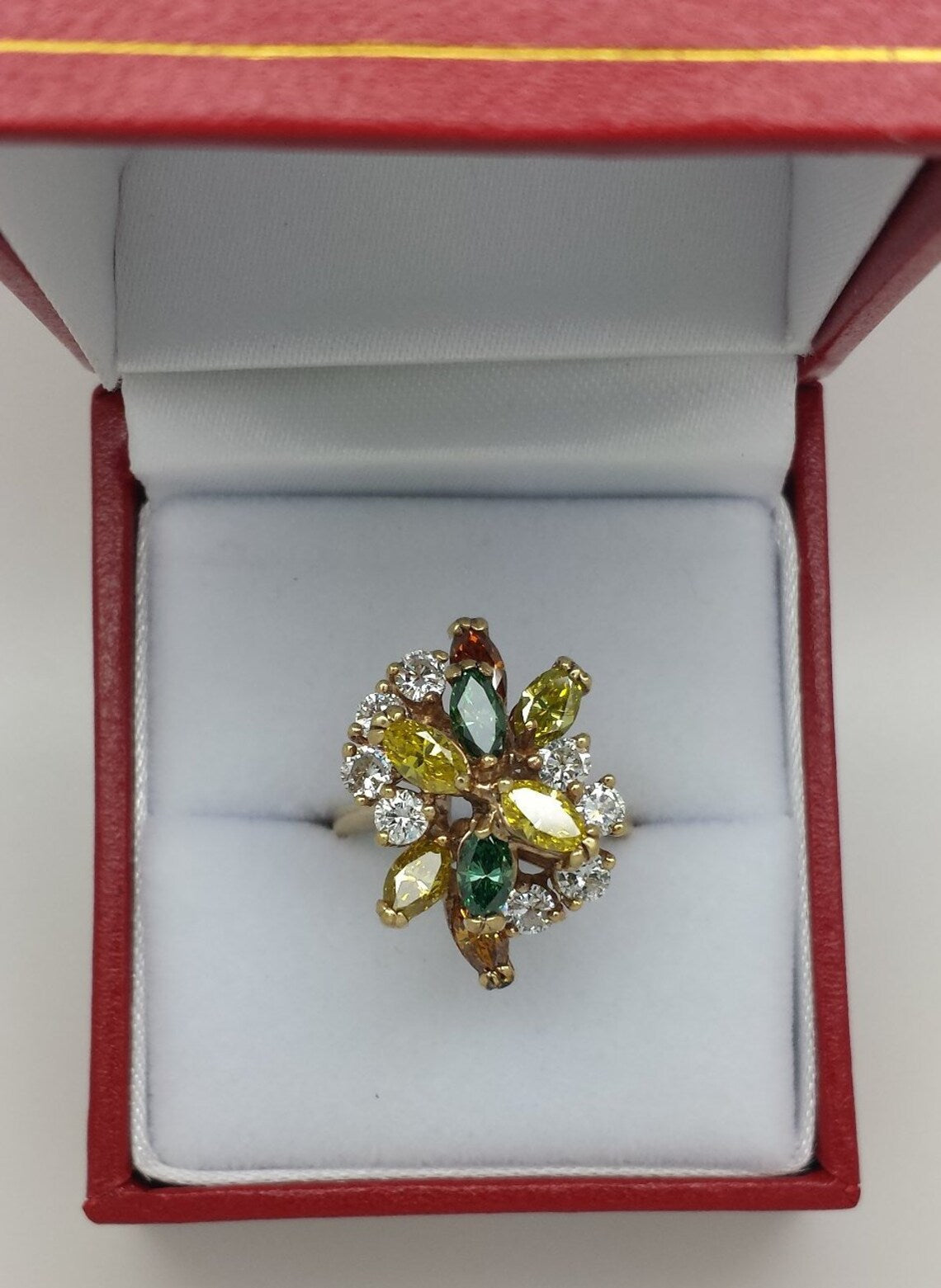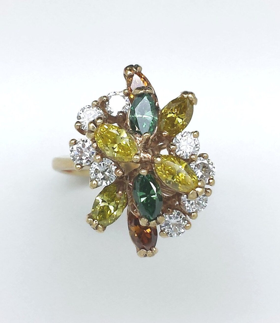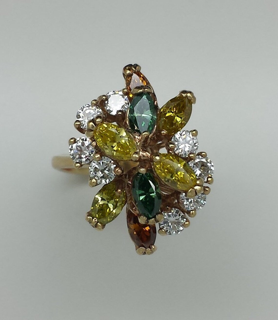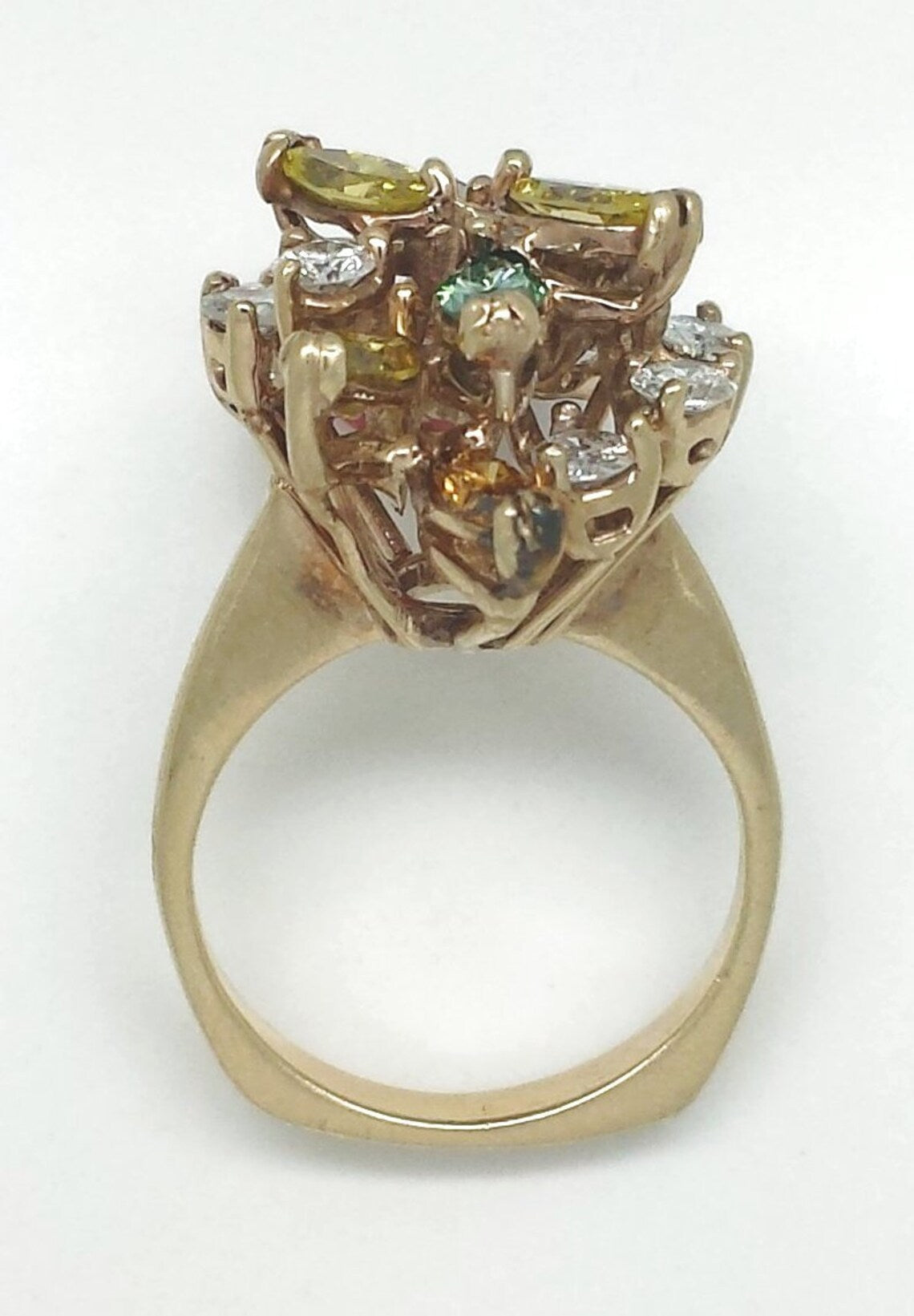A lady's estate 14k yellow gold fruit salad fancy color diamond dinner ring. c 1970s