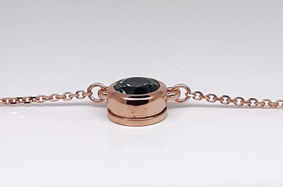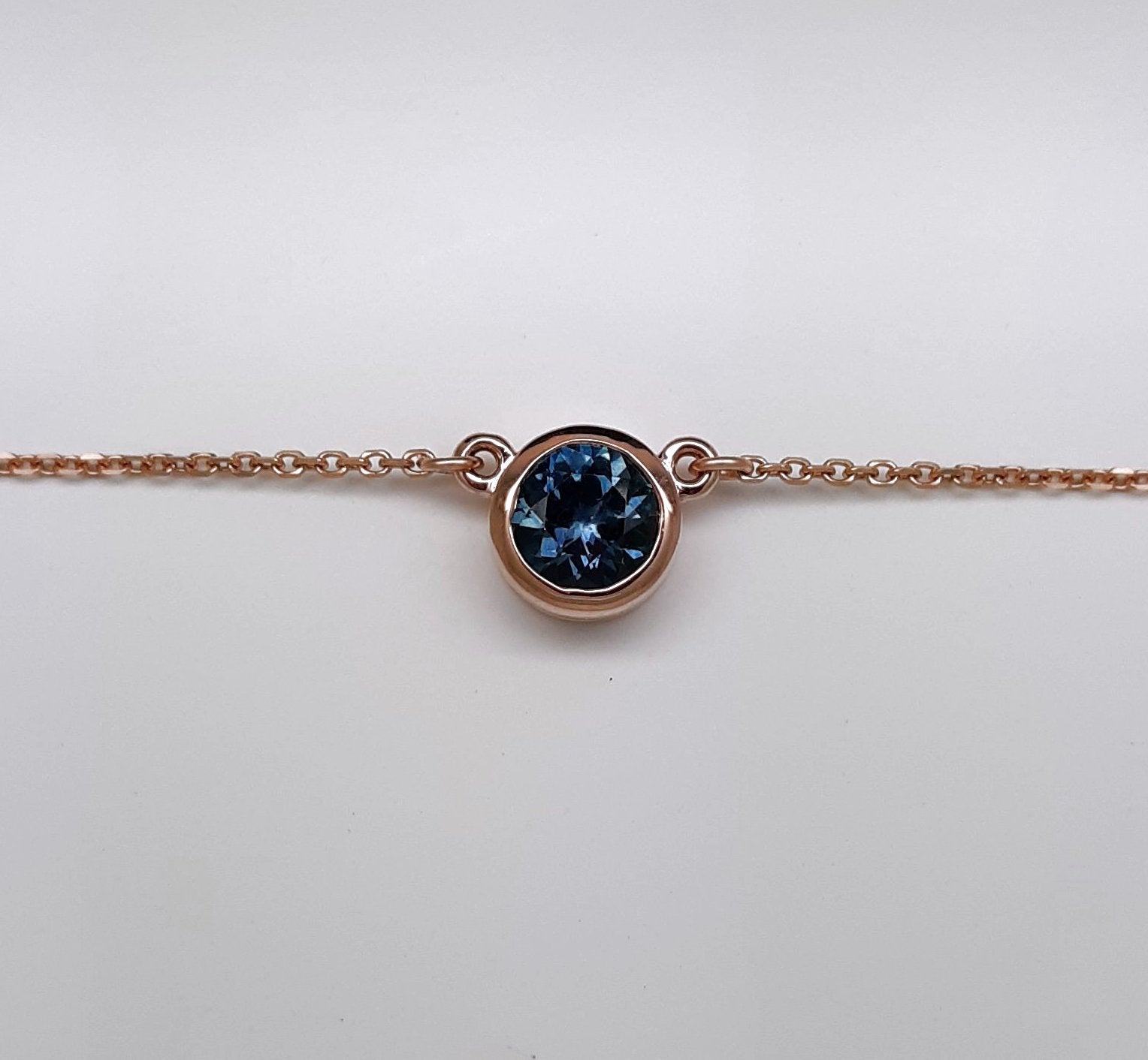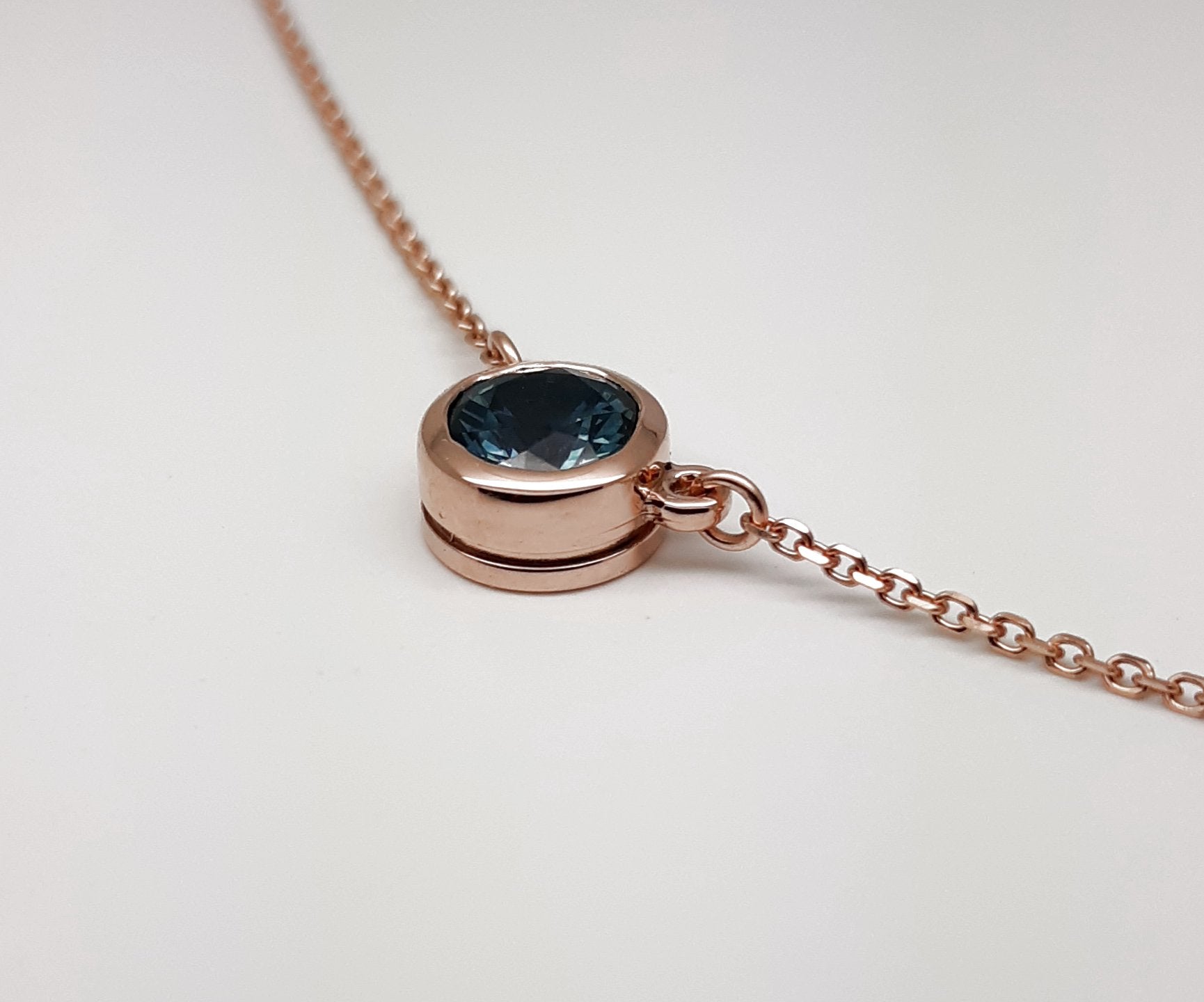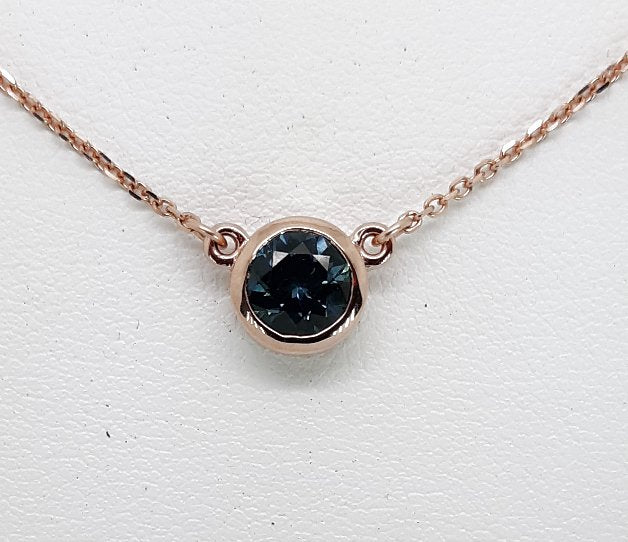 A lady's Minimalist 14k rose gold natural 0.95 carat Montana blue sapphire bezel pendant on chain.